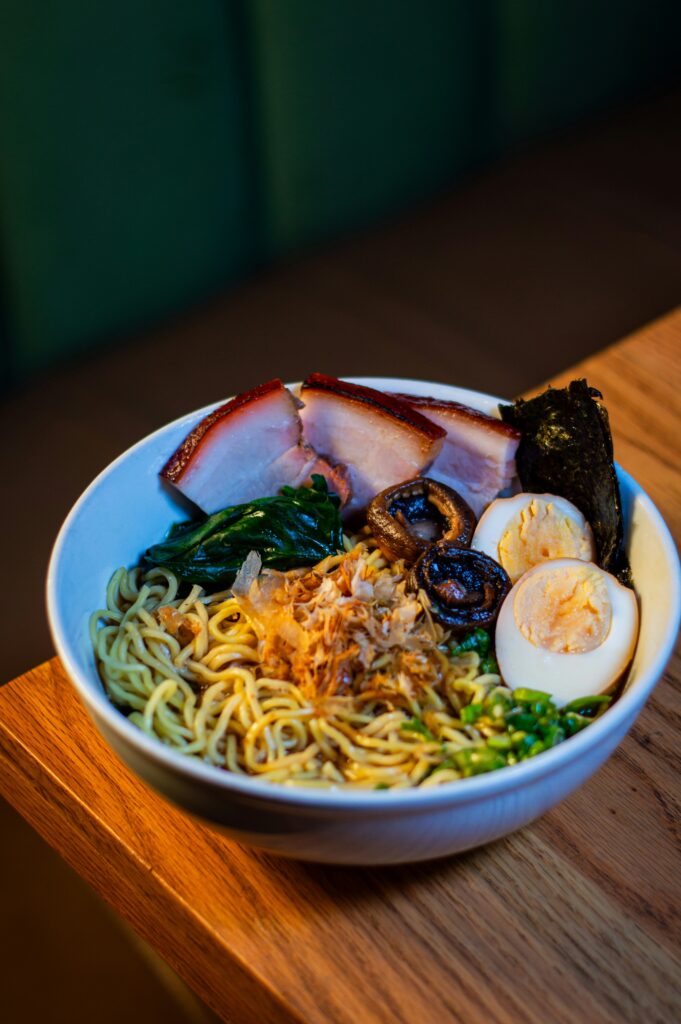 - Divide noodles into bowls, pour hot broth, add protein, eggs, and toppings.